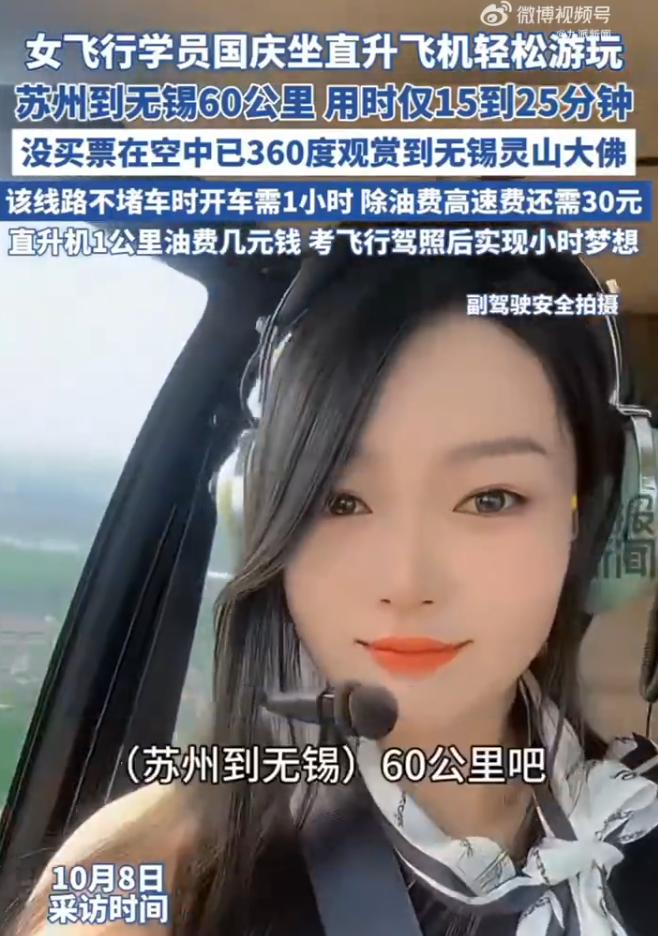 10月8日报道,江苏无锡。女飞行员国庆坐直升飞机轻松游玩,苏州到无锡60公里,用时仅15到25分钟,没买票在空中已360度观赏到无锡灵山大佛。