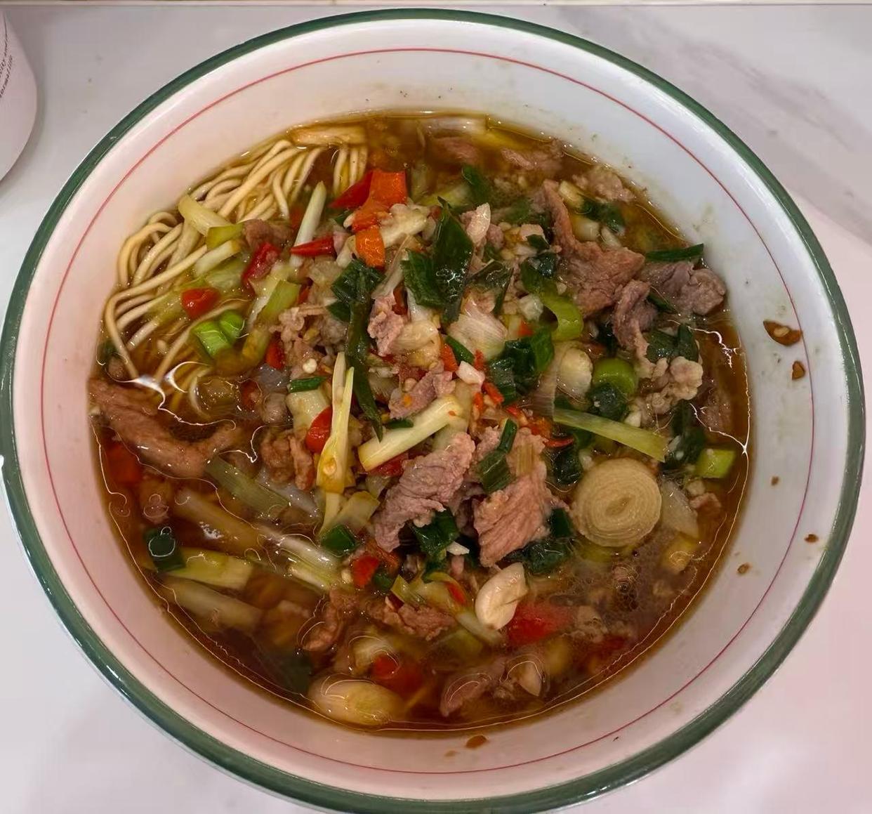 记者走入店中,正值午餐高峰,门店内坐满了顾客,在点餐口,记者告诉点菜员工“来份2号餐”,该店员询问记者是否能吃辣,之后便为记者端来一份韭黄炒肉汤面。此外,并未询问记者任何问题。