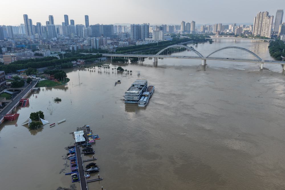 10月8日,邕江南宁市区河段水位不断上涨,沿岸景观被水淹没(无人机照片)。新华社记者 黄孝邦 摄