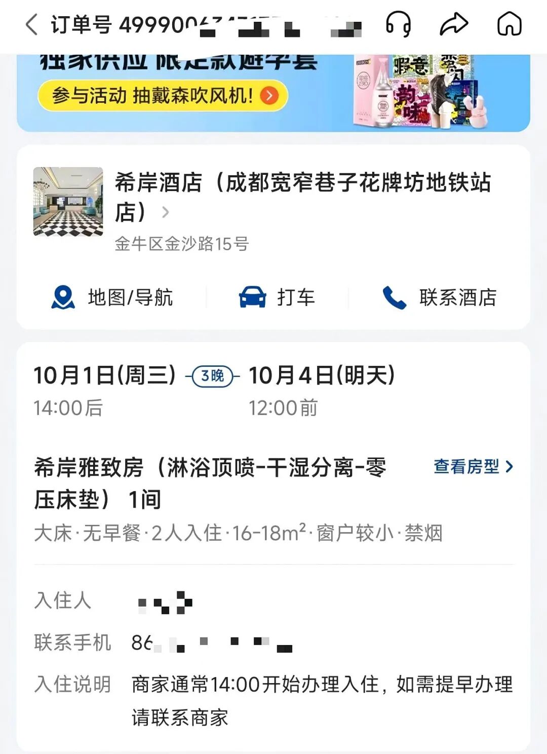 “我们是在网上预订的10月1日到10月4日的希岸酒店(成都市宽窄巷子花牌坊地铁站店)。”乔先生告诉记者,他们到店入住时是10月2日凌晨两点左右,“当时没发现任何问题。”