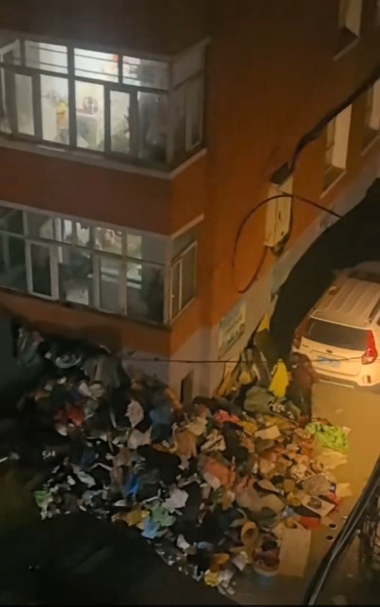 现场视频显示,从三楼阳台窗户抛下的东西约有两三米高,几乎遮住一楼住户的阳台。有工人将堆积如山的东西往车上转运。