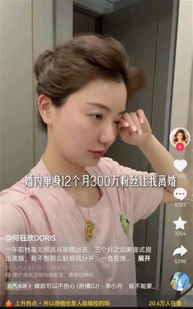 但是2024年12月初,何钰欣发布视频称,去年丈夫毫无预兆地提出离婚,她坚持不离婚。10月丈夫态度转变,她给了丈夫十五天时间,然而这期间丈夫没有主动发信息关心她,“每天在出差”。她觉得丈夫只是想堵住网友的嘴,并非真心想修补感情。