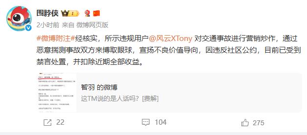 其表示,该用户是对交通事故进行营销炒作,通过恶意揣测事故双方来博取眼球,宣扬不良价值导向,违反社区公约。