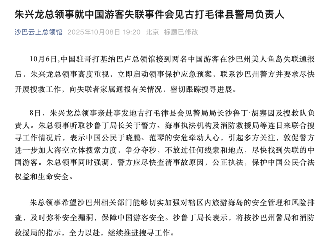 10月6日,中国驻哥打基纳巴卢总领馆接到两名中国游客在沙巴州美人鱼岛失联通报后,朱兴龙总领事高度重视,立即启动领事保护应急预案,联系沙巴州警方并要求尽快开展搜救工作,向失联者家属通报有关情况,密切跟踪搜寻进展。