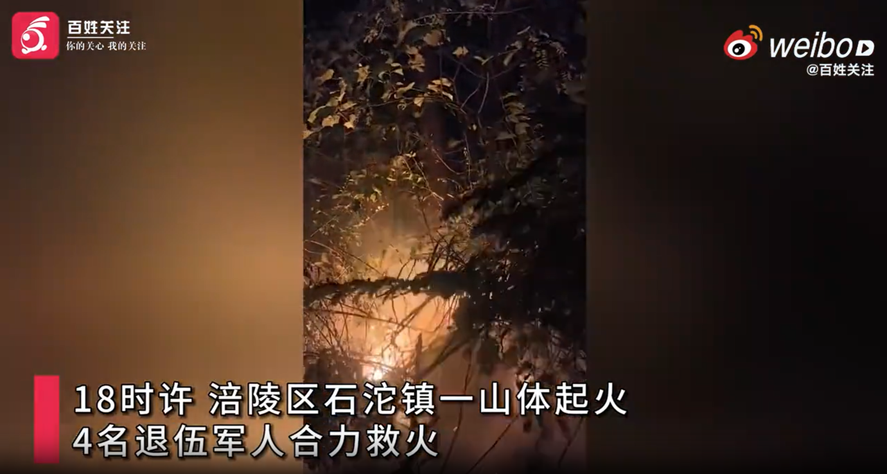 10月8日18时许,重庆市涪陵区石沱镇一处山体起火,4名退伍军人合力救火。