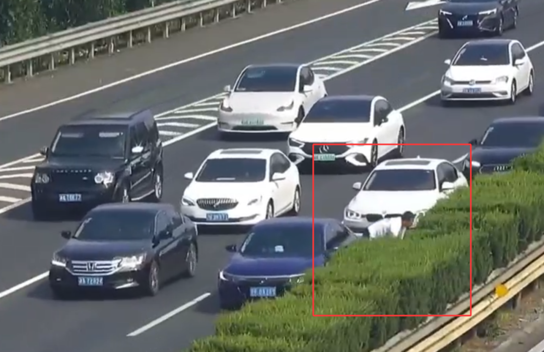 巡逻民警抵达现场后,迅速在后方做好预警。此时,施救人员刚协助故障车靠边,驾驶员夫妇竟不顾身旁车流,双双冲向中央护栏,并埋头在茂密的绿化带中翻找起来。