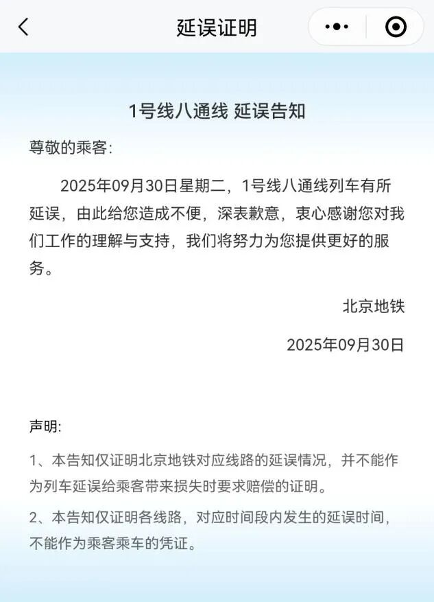 记者以市民身份致电北京地铁客服。对方回应称,事发当日地铁1号线确实发生故障,乘客可通过两种方式获取证明:一是在1号线八通线任意站点出站时向工作人员领取纸质版;二是通过“北京地铁”APP首页“延误证明”入口,在线下载当日电子版证明。