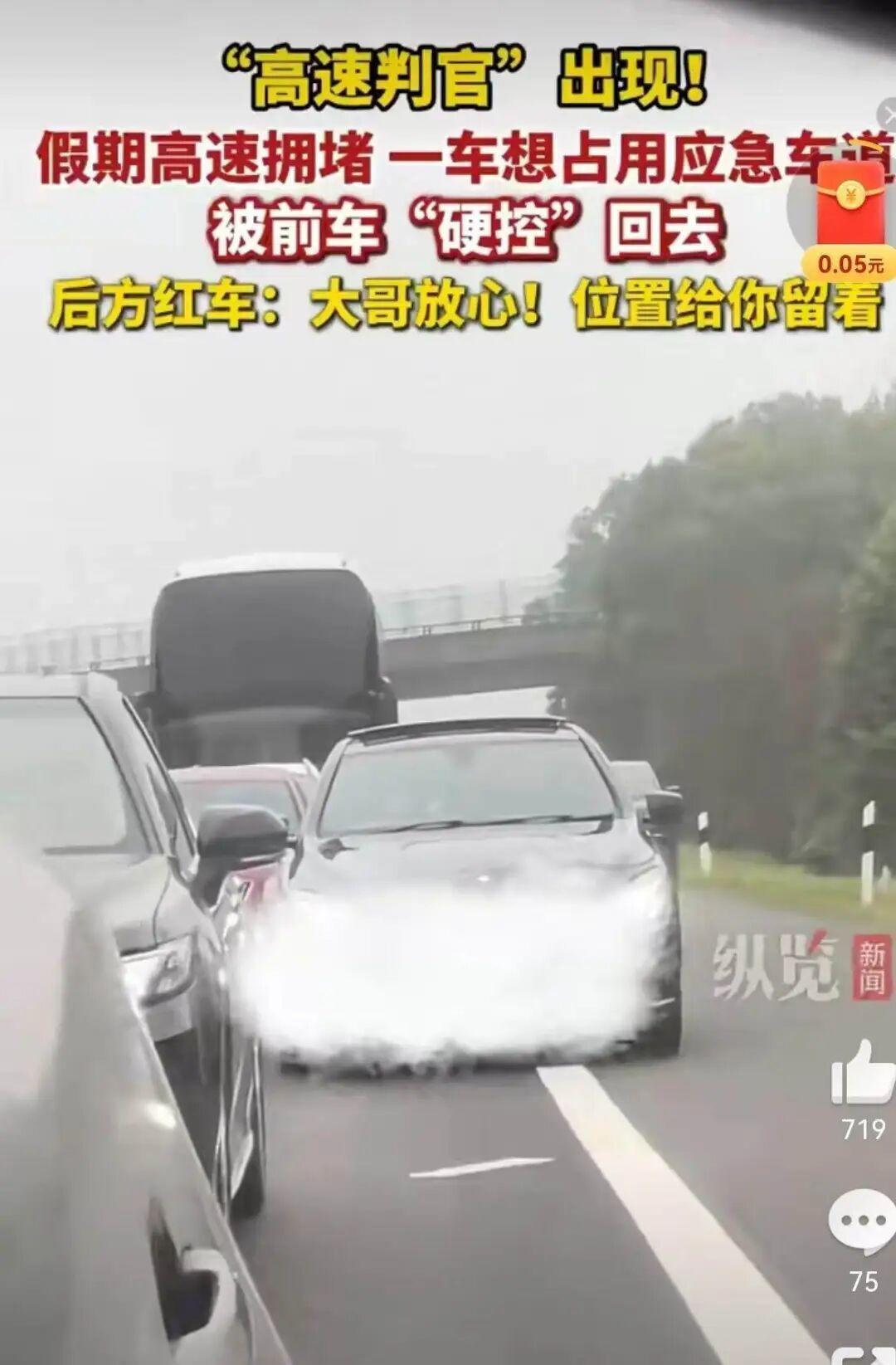 10月7日,江苏沪宁高速无锡段出现了“高速判官”,前后两车默契配合,成功阻止车辆占用应急车道。在G42、G2两条高速公路主线并行路段,这里车流高度饱和、匝道出口密集,在当日出行高峰时段,路段更是拥堵不堪,一辆社会车辆企图占用应急车道“加塞”,前车果断“硬控”阻止,后方红车亦默契配合留出位置,成功阻止车辆进入应急车道。