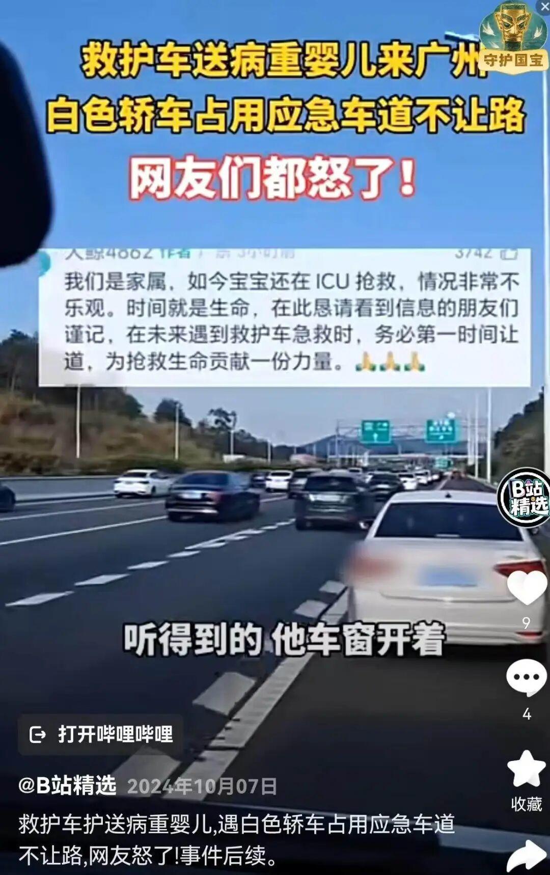 此次江苏沪宁高速无锡段的“高速判官”事件,引发了网友对于占用应急车道的讨论。羊城晚报记者梳理发现,观点几乎是一边倒的谴责。有网友质疑这是对守规矩者的不公,更有不少网友痛斥这种行为是“以自私凌驾生命”。最具代表性的便是2024年10月7日发生在广东阳江的事件,当时一辆救护车上载有因肠坏死刚做完开腹手术的十月龄婴儿,在紧急转院至广州的返程高峰途中,被一辆白色轿车长时间占用应急车道堵住,救护车多次鸣笛示意,对方仍拒不避让。