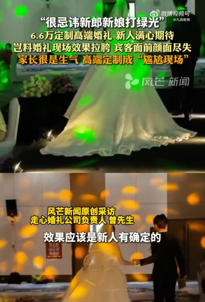 10月9日报道,湖南长沙。6.6万定制高端婚礼,新人满心期待,岂料婚礼现场效果拉胯,宾客面前颜面尽失。新郎汤先生告诉记者,很忌讳新郎新娘打绿光,“灯光设计花了9800元,最后就给我们呈现了这样的效果,不用打码都认不出新郎是谁。”