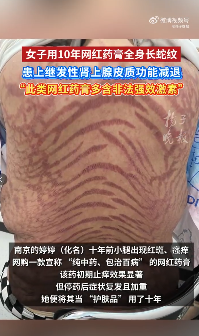 据扬子晚报报道,南京的婷婷十年前小腿首次出现红斑、瘙痒,她看到一款网红皮肤药膏,商家宣称纯中药制成,能“包治各类皮肤病”,婷婷使用后止痒效果明显,一旦停药,皮肤瘙痒、红斑复发,她不得不将这款药膏作为“日常护肤品”,这一用就是十年。如今,婷婷全身布满如蛇纹般的裂纹,还伴随“满月脸”、高血压等症状,最终被确诊为“继发性肾上腺皮质功能减退”,医生发现致病根源正是她依赖十年的网红皮肤药膏。