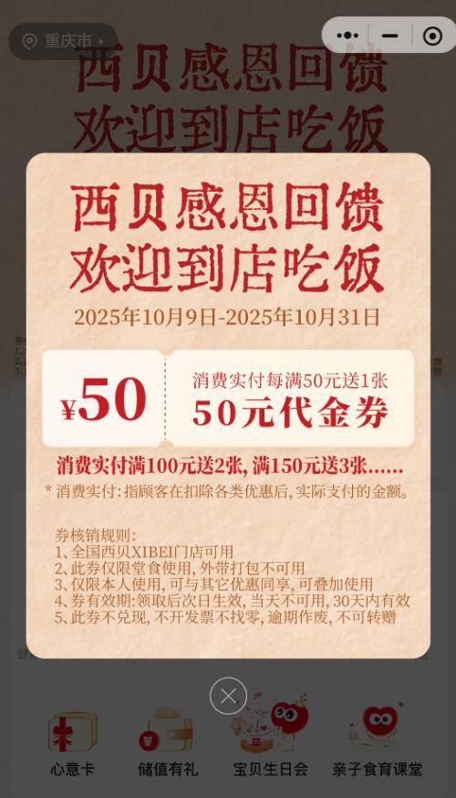 10月9日,西贝通过其官方小程序再发送代金券活动。10月9日至10月31日,消费实付每满50元送1张50元代金券,消费实付满100元送2张,满150元送3张。