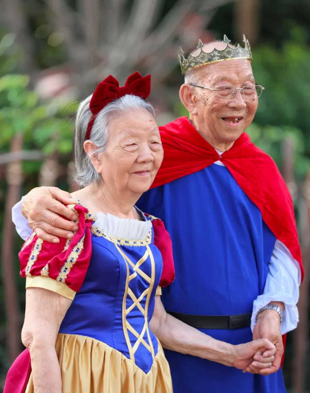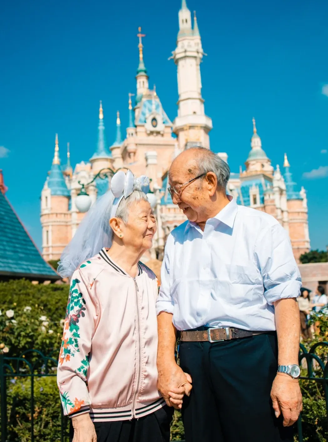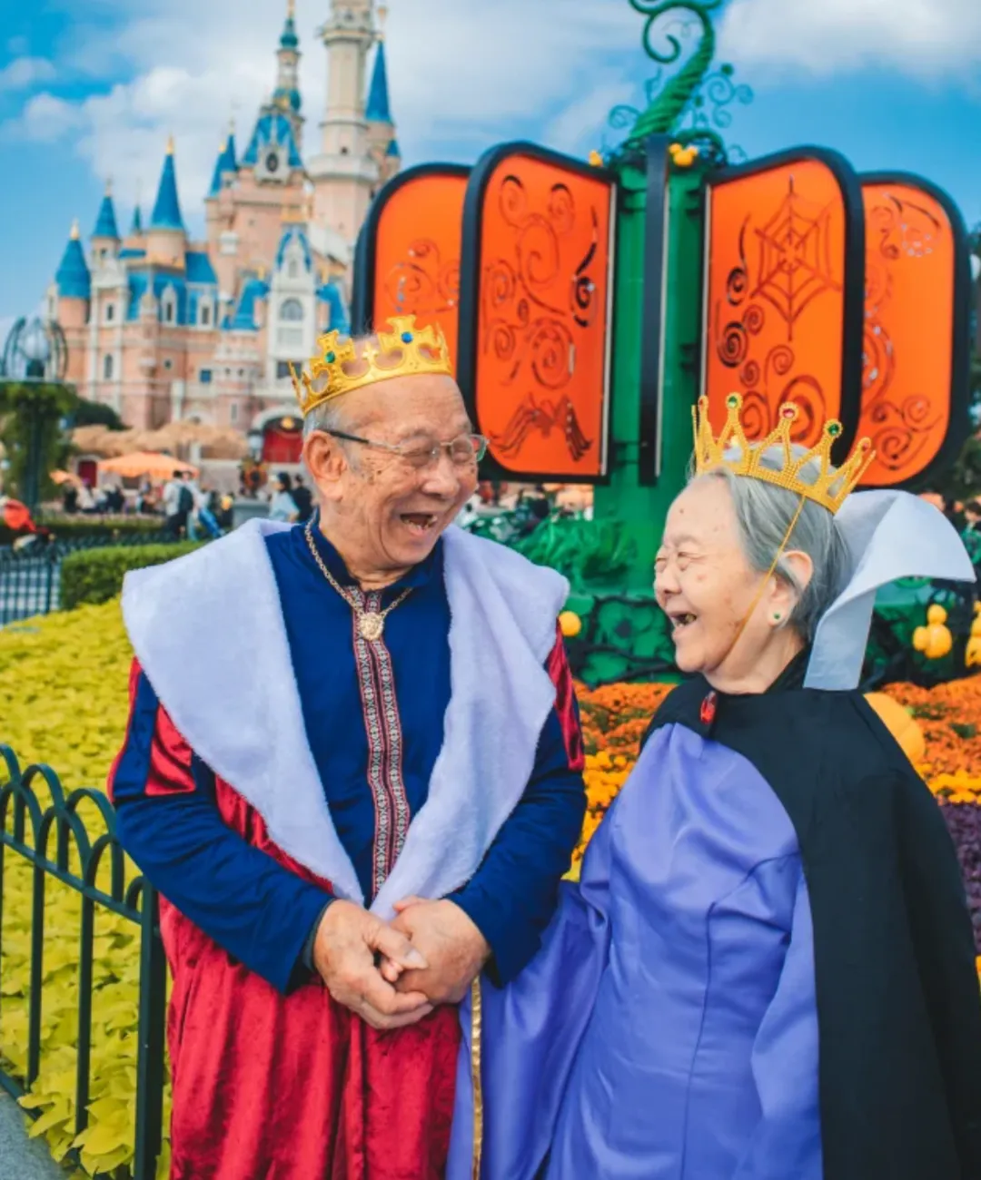 10月8日,不少网友在网上晒出照片,分享自己在上海迪士尼看到的一对老人,他们穿上了王子公主的装扮,在迪士尼游玩,吸引了很多游客的目光。