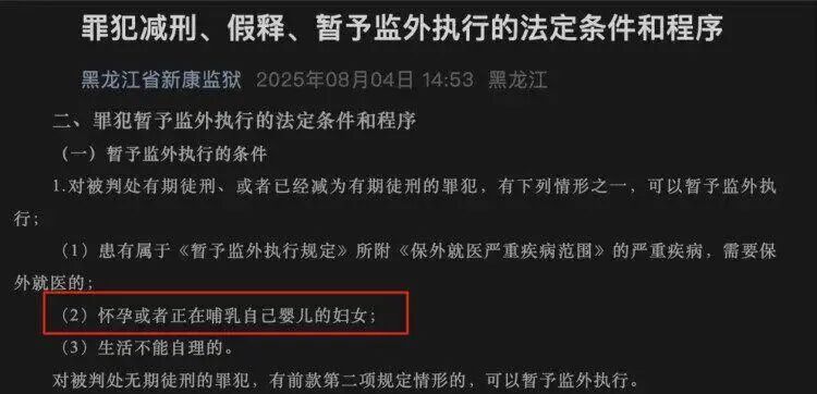 北京华一律师事务所律师秦旭东告诉红星新闻,针对怀孕、哺乳女性实行暂予监外执行的法律规定比较明确,符合法治原则和人道主义精神。