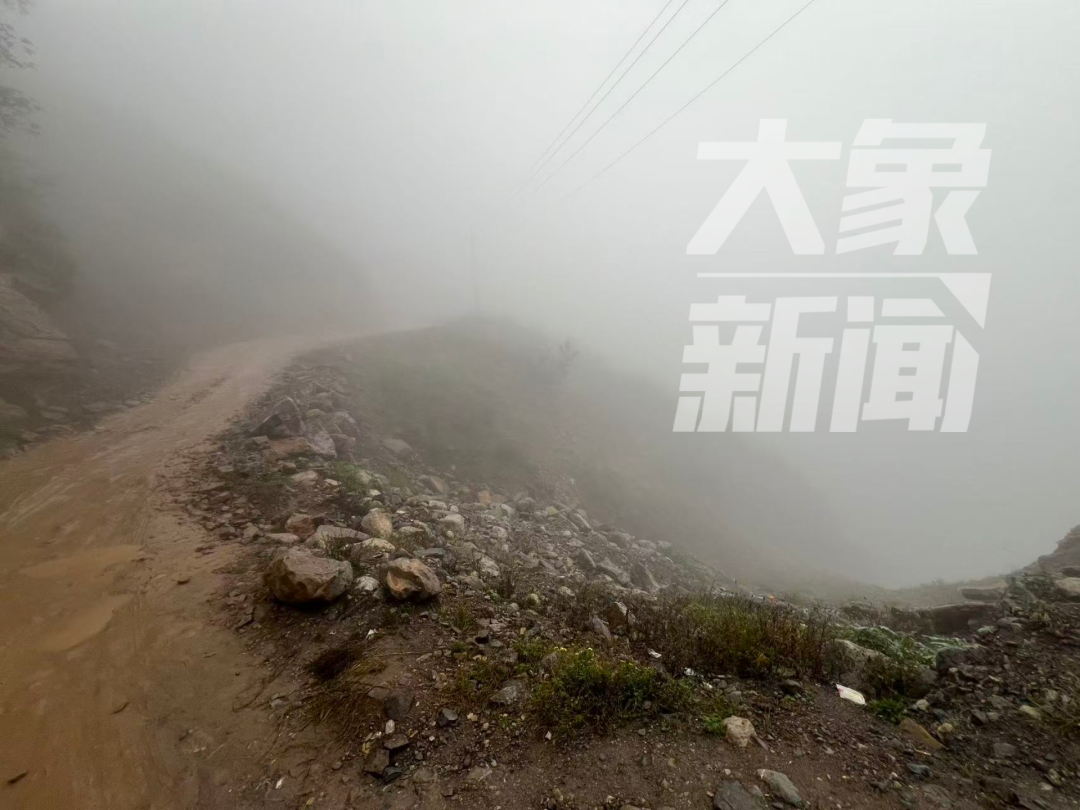 10月10日中午,大象新闻记者赶往事发地点。当地天气条件恶劣,事发区域持续阴雨,气温骤降至13℃,山区出现大雾,能见度不足4米。