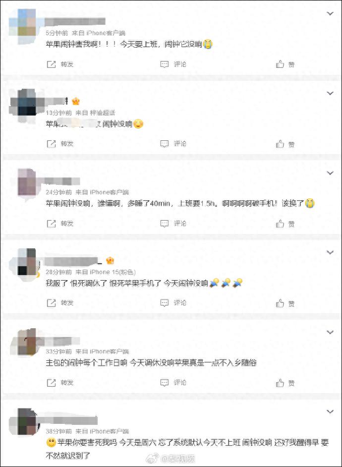 今天一早不少苹果用户吐槽,“周六调休上班,但闹钟没响,差点睡过头”。还有网友表示,闹钟没响,已经睡过了。