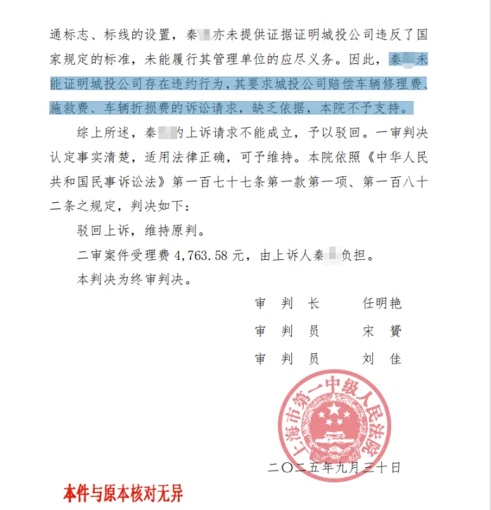 10月10日,秦先生收到了该案二审判决书。上海市第一中级人民法院审理后认为,秦先生未能证明城投公司存在违约行为,其要求城投公司赔偿车辆修理费、施救费、车辆折损费的诉讼请求,缺乏依据,不予支持,驳回上诉。