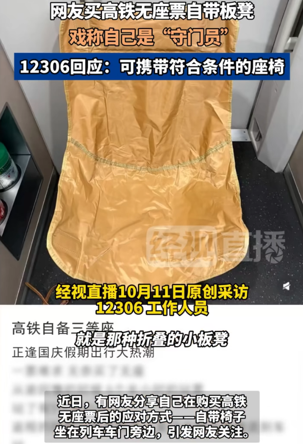 据经视直播消息,国庆假期出行高峰,“一票难求”成为不少旅客的困扰。近日,有网友分享了自己的应对方式:在购买高铁无座票后,自带椅子坐在列车车门旁边的区域,并幽默地称自己当了一回高铁“守门员”,引发网友关注。