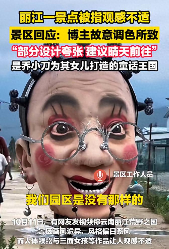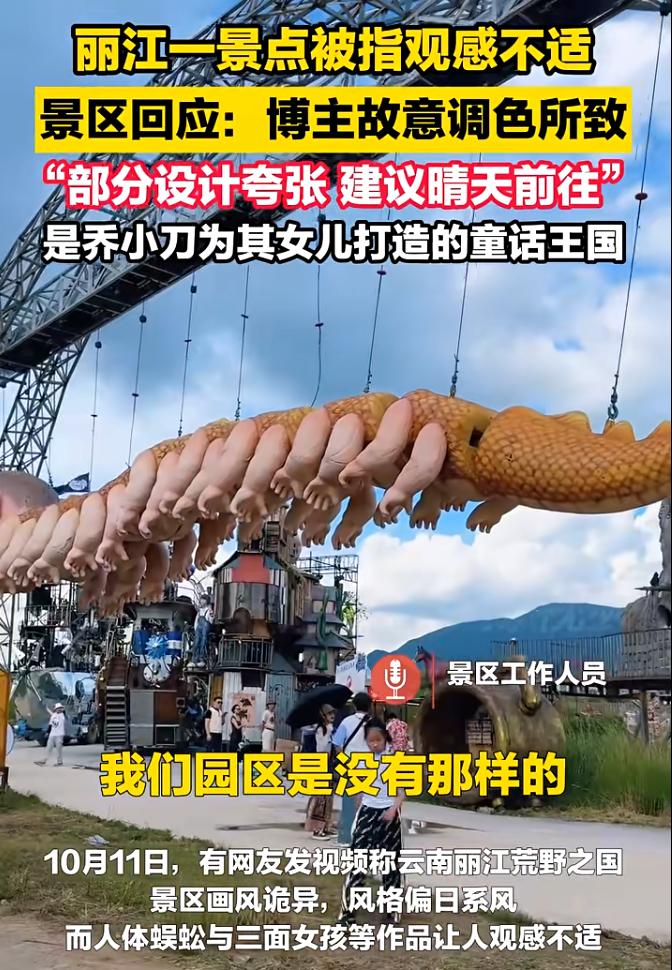 近日,有网友发视频称云南丽江荒野之国景区画风诡异,人体蜈蚣与三面女孩等作品让人观感不适。