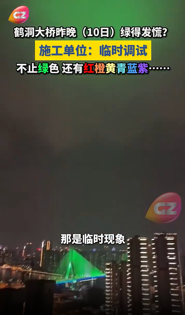 广州广播电视台从鹤洞大桥照明系统提升工程负责人叶锦辉获悉,厂家将基准颜色设置为了绿色,他们需要全桥通电才可以开始调试。市民们看到的桥发绿光是是临时现象,鹤洞大桥安装的灯是彩色灯,可以根据节日气氛去调节。