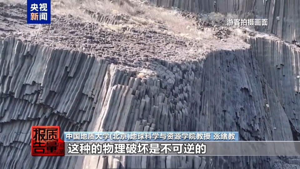 中国地质大学(北京)地球科学与资源学院教授 张绪教:游客上岛以后,他们攀爬到柱状节理上边,对柱状玄武岩造成破坏,这种物理破坏是不可逆的。
