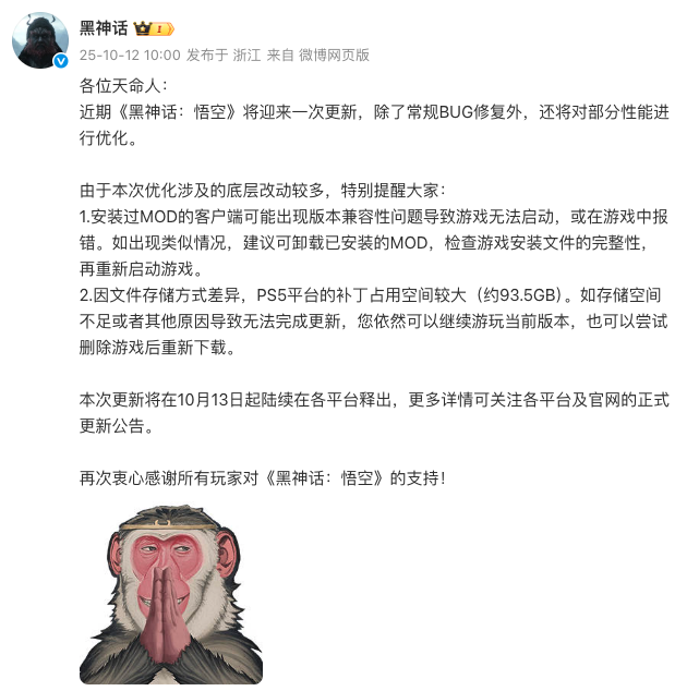 10月12日,@黑神话 宣布,近期《黑神话:悟空》将迎来一次更新,除了常规BUG修复外,还将对部分性能进行优化。本次优化涉及的底层改动较多,更新将在10月13日起陆续在各平台释出。官方提醒:因文件存储方式差异,PS5平台的补丁占用空间较大(约93.5GB)。