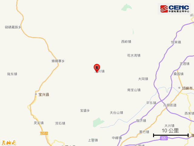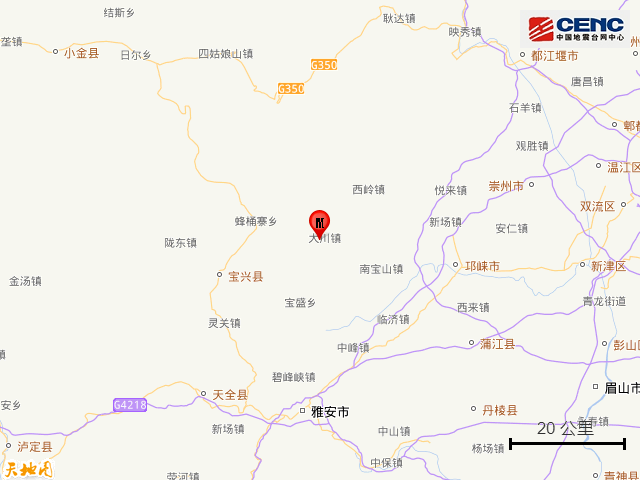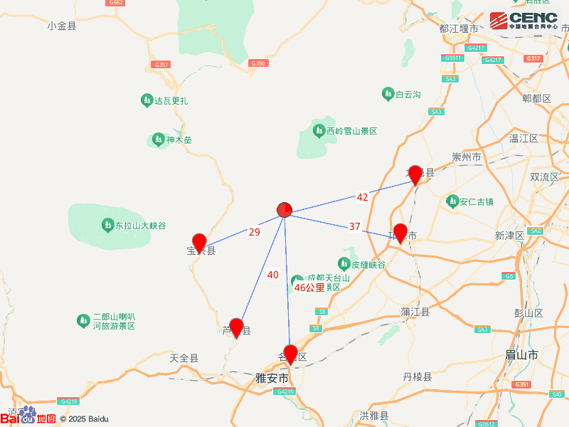 周边县城:震中距宝兴县29公里、距邛崃市37公里、距芦山县40公里、距大邑县42公里、距名山区46公里,距雅安市53公里,距成都市96公里。
