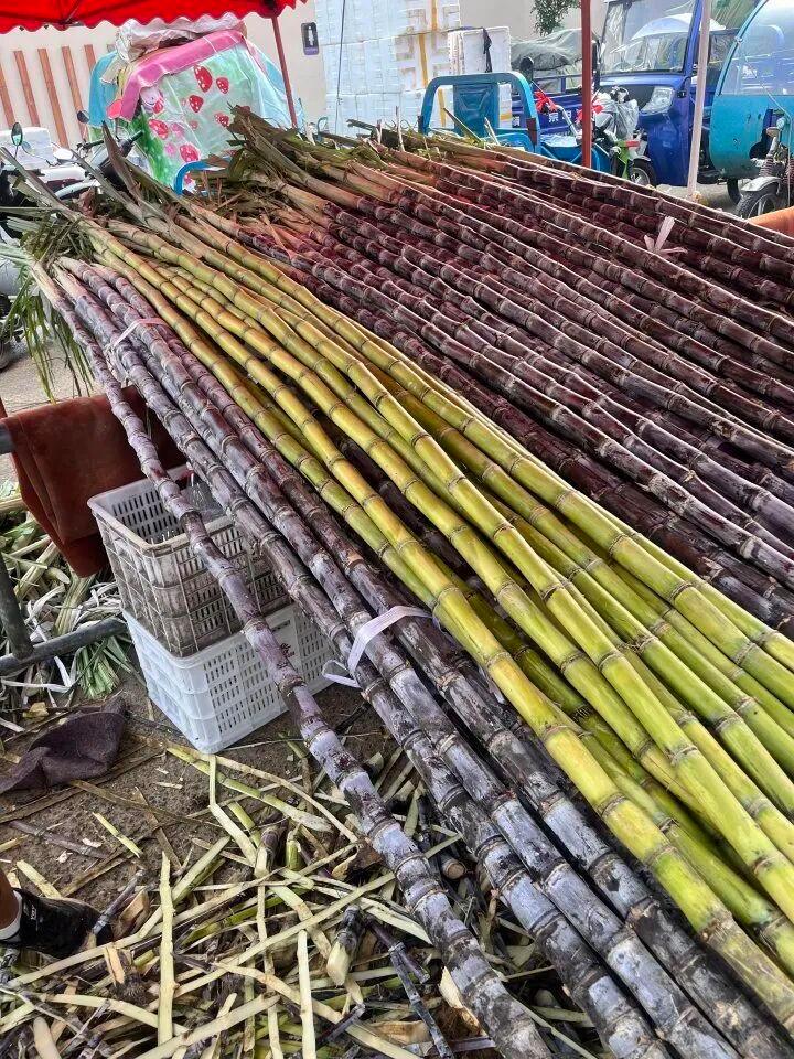 这两天去杭州临平的红丰农贸市场,会发现甘蔗摊是越摆越多了,而且除了海南甘蔗,浙江江山的甘蔗也已上市。浙江的甘蔗便宜些,紫皮的15元一根,青皮的18元一根,海南的甘蔗每根都要贵上几块钱,个头都很大,长得像竹竿一样。