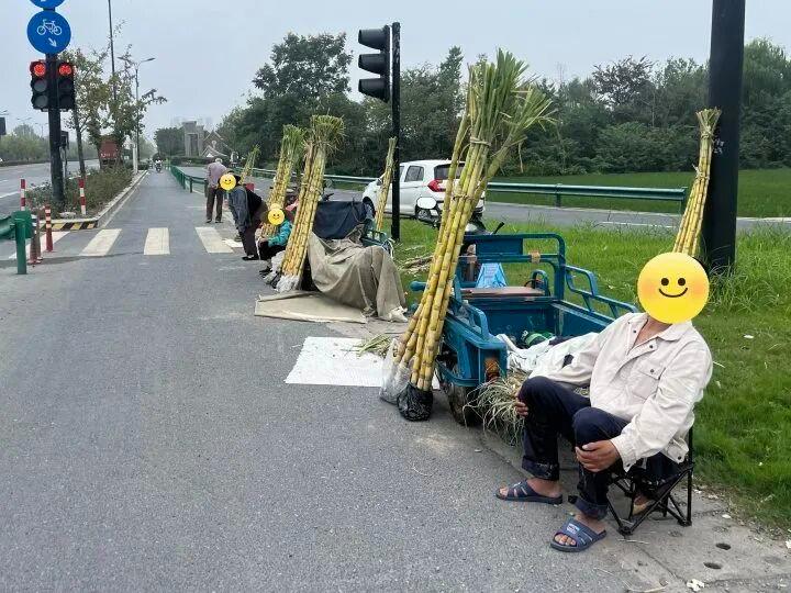 但在杭州临平荷禹路和杭南路交叉口,能看到一捆捆青色的本地甘蔗,整齐地摆在村口叫卖。每个摊主的造型也是相当统一,戴着草帽,坐在一辆拉货的小三轮旁,甘蔗上面用稻草捆好,下面用塑料袋装好。
