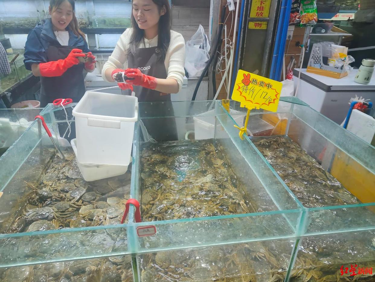 国庆中秋“双节”过后,大闸蟹的热度逐渐降低,10月12日,红星新闻记者走访成都多个水产市场了解到,当前大闸蟹总体价格较节日期间下降了约四分之一,较为热销的二两母蟹售价约为12元一只。大闸蟹批发商赵桂华表示:“预计后续大闸蟹价格稳中有降,但幅度不大,当前的大闸蟹正是满膏满黄的时候,口感已经达到最佳状态!”