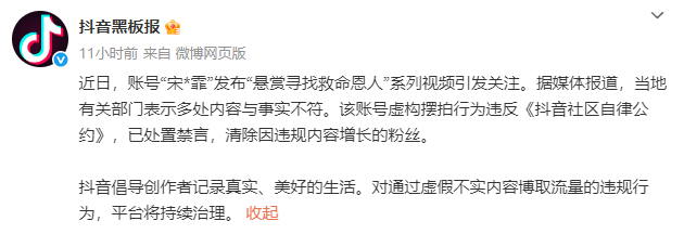 近日,账号“宋*霏”发布“悬赏寻找救命恩人”系列视频引发关注。据媒体报道,当地有关部门表示多处内容与事实不符。该账号虚构摆拍行为违反《抖音社区自律公约》,已处置禁言,清除因违规内容增长的粉丝。