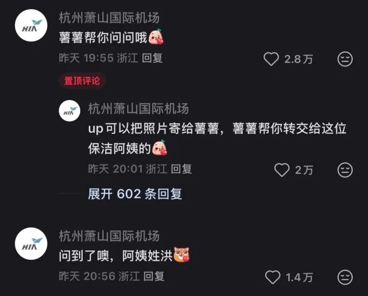 很快,杭州萧山国际机场官方账号就在评论区回复:“薯薯帮你问问哦!”“可以把照片寄给薯薯,我们帮你转交。”不到一小时又回复“问到了噢,阿姨姓洪。”
