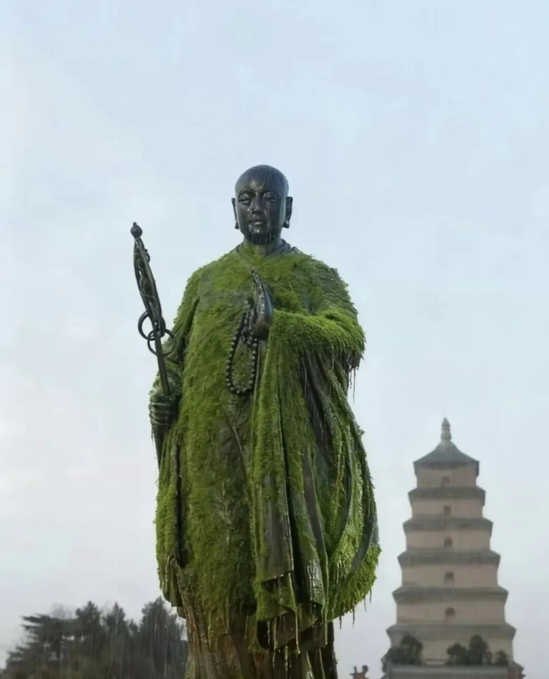 近日,有网友发文称,西安连续下雨导致城墙长了青苔,并附了一张大雁塔南广场玄奘法师雕塑也布满绿色青苔的图片,引发网络热议。有网友指出,城墙长青苔属实,但玄奘法师像的图片疑为不实信息。