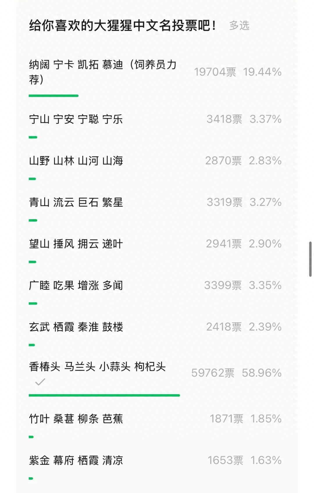 投票中,一组接地气的名字“香椿头”“马兰头”“小蒜头”“枸杞头”凭借超59000票暂居第一,而饲养员力荐的音译组“纳阔、宁卡、凯拓、慕迪”紧随其后。