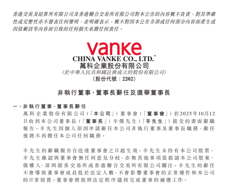 根据万科企业在港交公告,于2025年10月12日收到公司董事长辛杰提交的书面辞职报告。辛杰因个人原因申请辞任本公司非执行董事及董事长职务,辞任后将不再担任本公司任何职务。