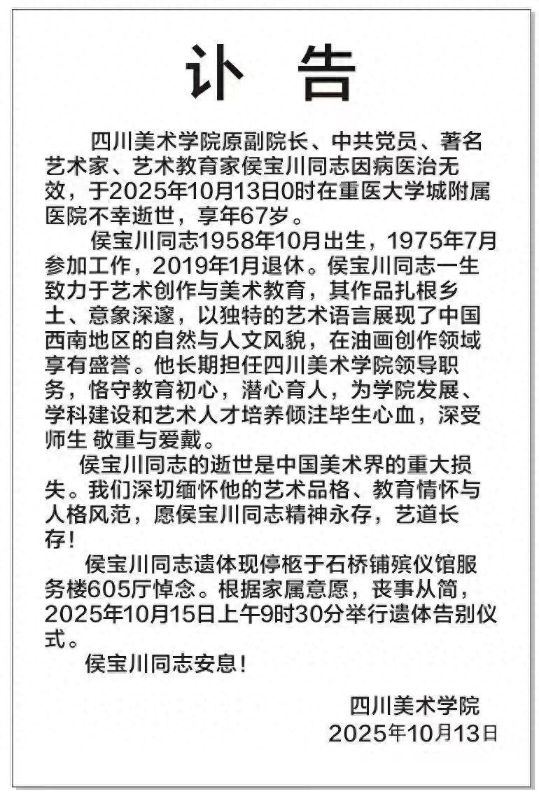 10月13日中午,四川美术学院原副院长、艺术家侯宝川的朋友圈发出了一条简单的讣告——