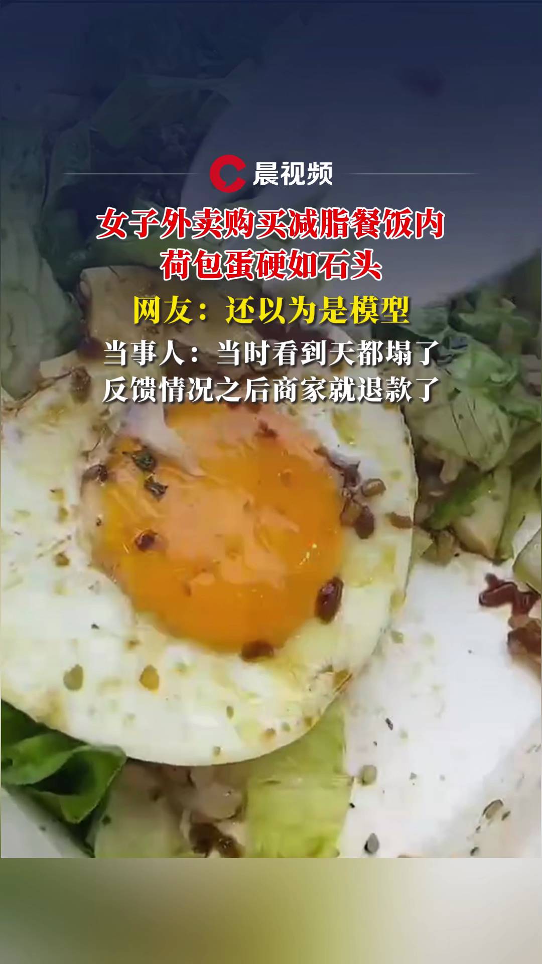 10月13日,浙江台州一网友发布视频,画面中女子用叉子戳着碗里的荷包蛋,没想到鸡蛋却坚硬如石,对此网友纷纷留言调侃,莫不是商家把模型当作商品做了出去,随后潇湘晨报记者联系到视频发布者何女士,何女士告诉记者,自己是12日下午购买的这一份减脂餐。