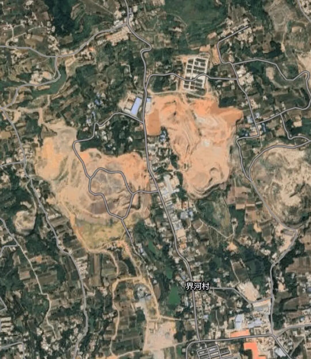 卫星地图显示,界河村附近有多处疑因矿产开采导致的大面积土地裸露,该村西侧一公里处有一名为“煤矿工人新村”的地方。记者搜索发现,该村注册有多家铝土矿和煤矿开采企业。