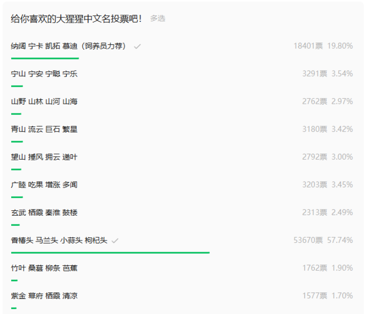 经过挑选,10月11日,南京市红山森林动物园公布了候选名字,其中包括饲养员力荐的“纳阔、宁卡、凯拓、慕迪”等10组名字。但在投票时,众多网友的画风逐渐跑偏,被称为“野菜F4组合”的“香椿头、马兰头、小蒜头、枸杞头”以绝对优势杀出重围,碾压饲养员力荐的文艺名字“纳阔、宁卡、凯拓、慕迪”,甚至还有网友在网上科普南京的野菜,为“野菜F4组合”拉票。