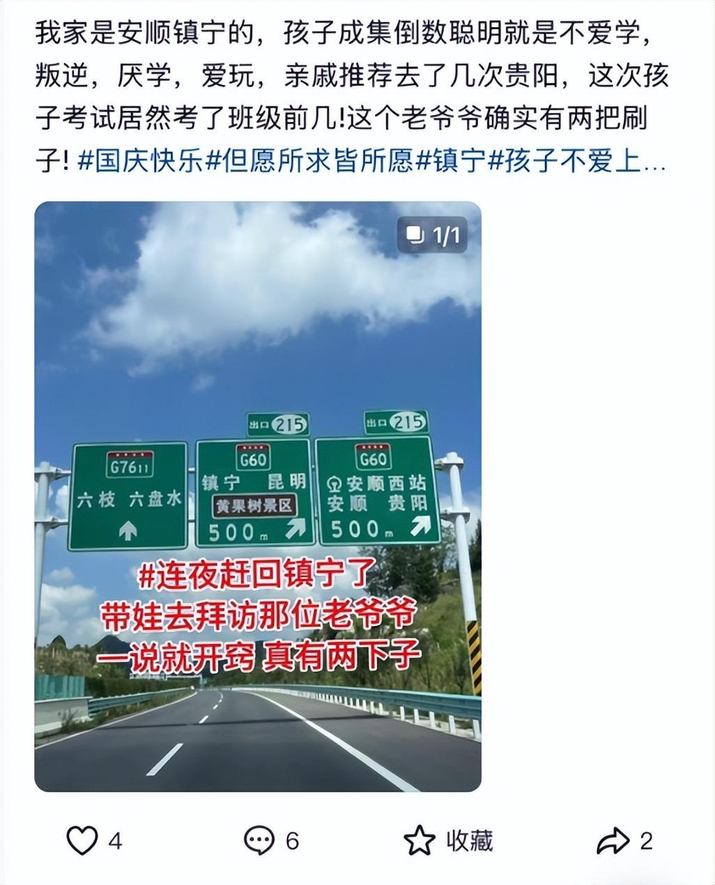 下午4时07分,另一名网友发布内容几乎一致,称自己来自安顺市紫云自治县,孩子就读紫云二中,症状与前述视频描述一致,经过“老爷爷”治疗后,效果“显著”——孩子考了第六名。该视频同样配了一张学校照片,照片上有“放弃了”字样。