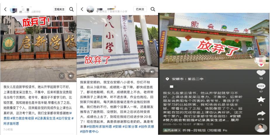 三名发布者的视频截图,分别称孩子在安顺西秀区启新学校、安顺八小、紫云二中读书,发布内容的形式、文案雷同。