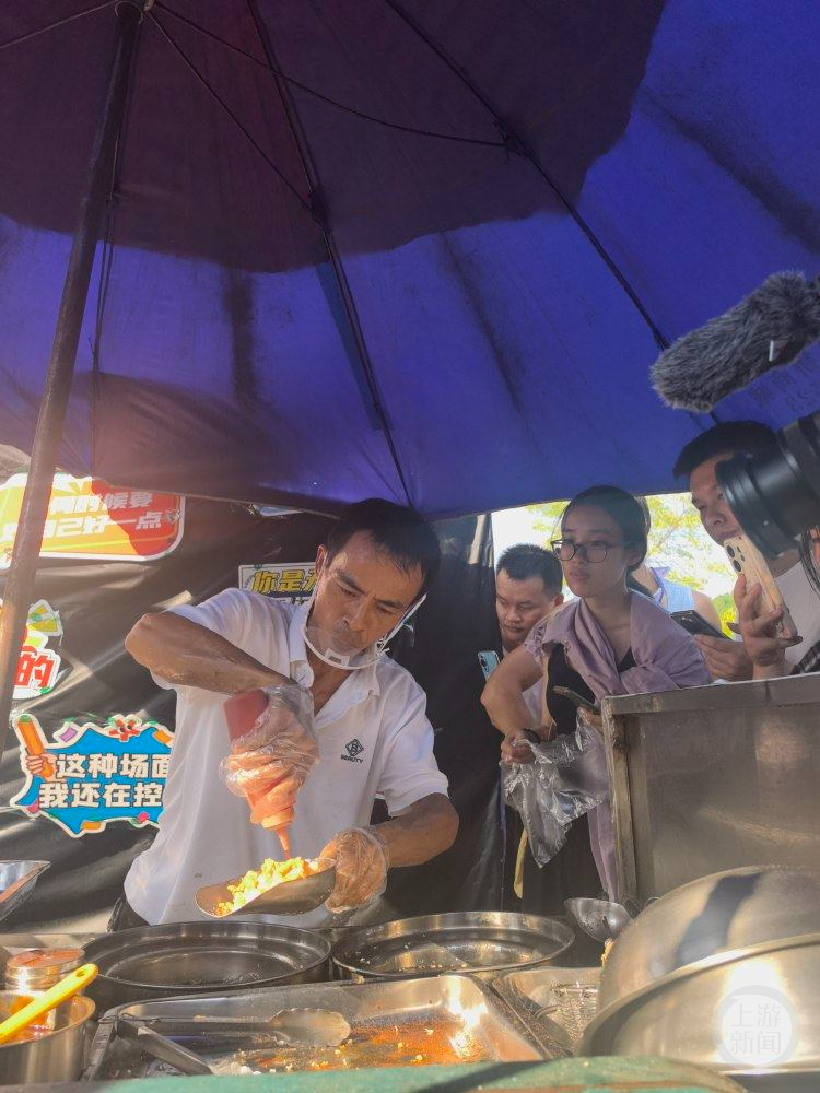 “鸡排哥”摊位也显示着众生百态:连续两天,上游新闻记者都看见,有主播来这里直播,有商家来这里打广告,有其他鸡排摊主来“傍大牌”。甚至还有一位自称是某商业大佬未婚妻的人找到“鸡排哥”亲属,想用年薪百万美金挖“鸡排哥”合作快餐店,但经上游新闻记者核实此人非该商业大佬未婚妻。