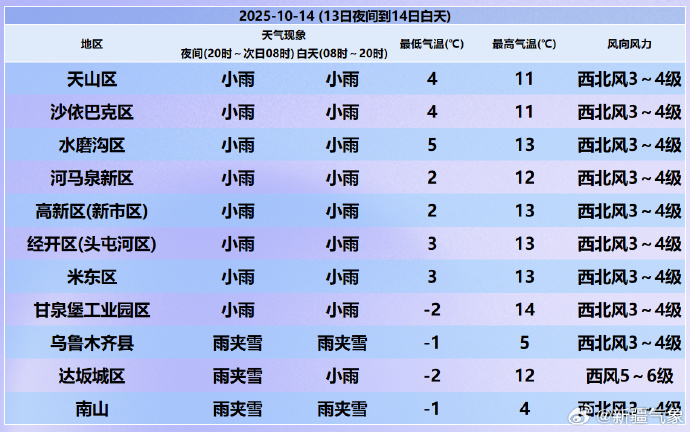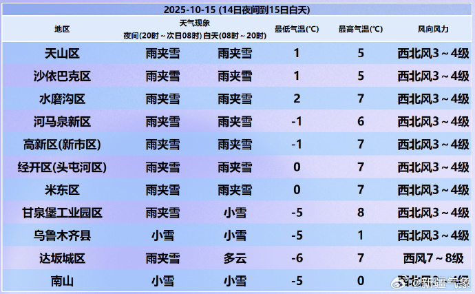 预计今天夜间到明天白天,乌市大部区域多云有小雨,南郊和山区多云有雨夹雪,上述区域伴有3-4级西北风,达坂城区雨夹雪转小雨伴5-6级偏西阵风;明天夜间到后天白天,大部区域多云有雨夹雪,南郊和山区有小雪,上述区域伴有3-4级西北风,达坂城区雨夹雪转多云伴有7级偏西风,阵风9级左右。