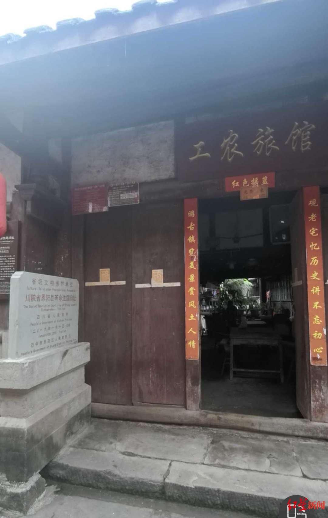 10月11日,红星新闻记者前往巴中市恩阳区恩阳古镇,找到了网上拍卖的这座四合院,大门上挂着“工农旅馆”的招牌,为木房结构,位于恩阳古镇景区内一条主干道上。门口,立有省级文物保护单位、川陕省恩阳县革命法庭旧址石碑,由巴中市恩阳区人民政府所立。