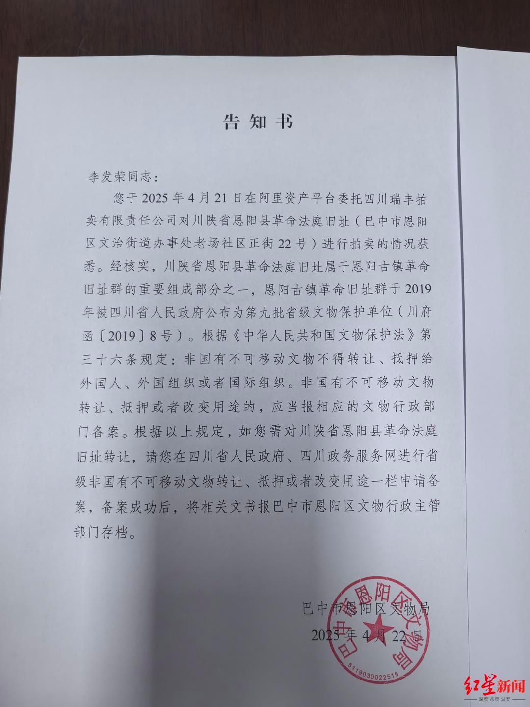 《告知书》显示,4月21日在阿里拍卖平台委托拍卖公司对该房屋进行拍卖,称“经核实,川陕省恩阳县革命法庭旧址属于恩阳古镇革命旧址群的重要组成部分,恩阳古镇革命旧址群于2019年被四川省人民政府公布为第九批省级文物保护单位(川府函[2019]8号)。根据《中华人民共和国文物保护法》第三十六条规定:非国有不可移动文物不得转让、抵押给外国人、外国组织或者国际组织。非国有不可移动文物转让、抵押或者改变用途的,应该报相应的文物行政部门备案”。如需转让,“在四川省人民政府、四川政务服务网进行申请备案,备案后再将相关资料送巴中市恩阳区文物行政主管部门存档”。