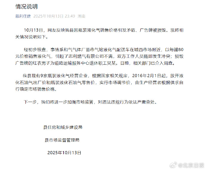 10月13日,湖南慈利通报“网友反映因瓶装液化气销售价格引发矛盾、广告牌被损毁”: