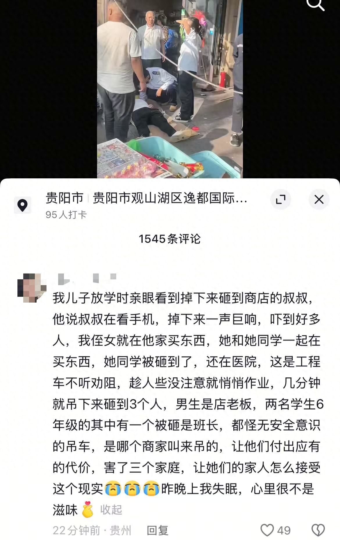 10月13日,有网友发视频称贵阳观山湖区逸都国际学校门口,有两名小孩和一位大人被吊车搬运的大桶砸倒在地,视频画面中可以看到现场已有120急救车赶到,一位男子躺在地上,周围有群众上前查看情况。