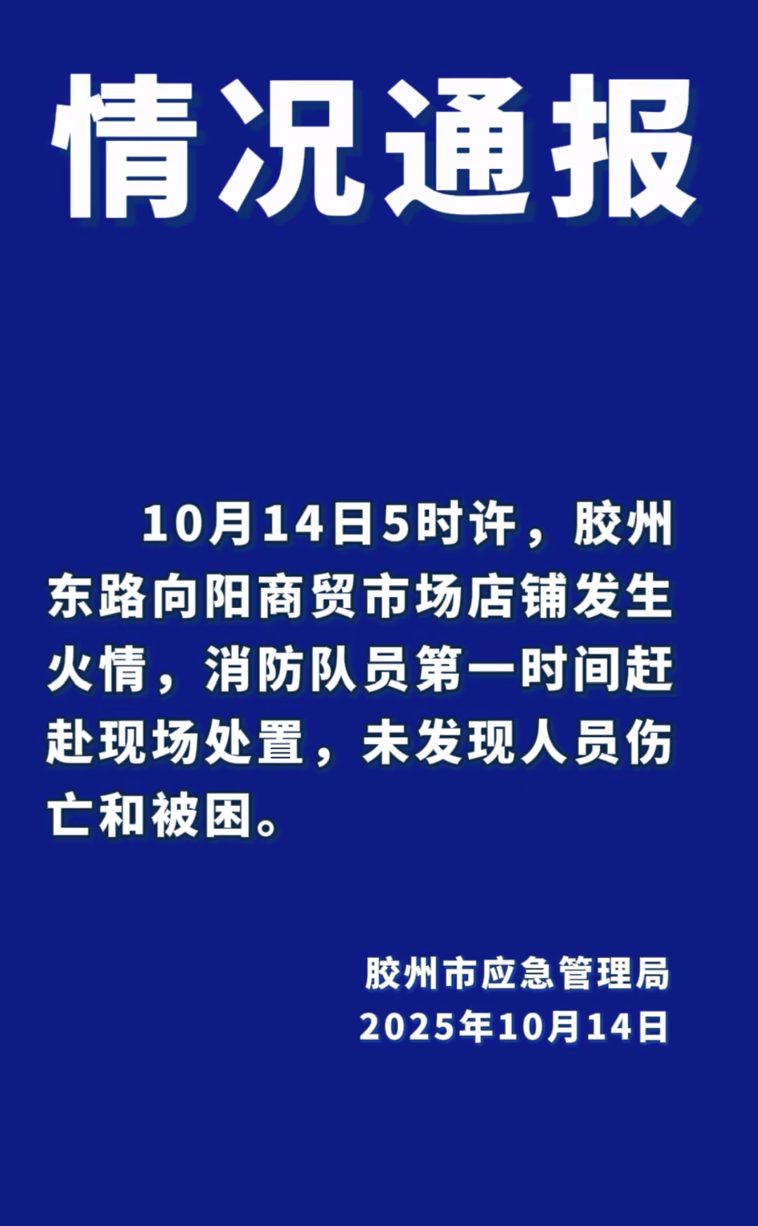 记者从胶州市应急管理发布的信息了解到,10月14日5时许,胶州东路向阳商贸市场店铺发生火情,消防队员第一时间赶赴现场处置,未发现人员伤亡和被困。