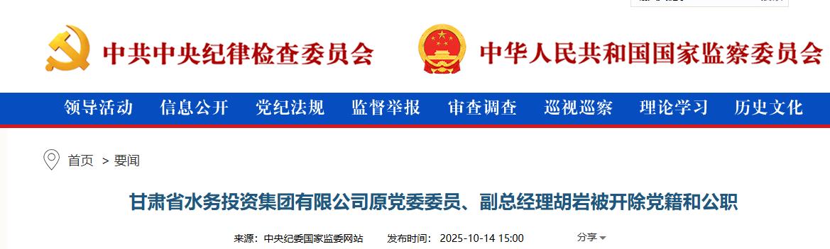日前,经甘肃省委批准,甘肃省纪委监委对省水务投资集团有限公司原党委委员、副总经理胡岩严重违纪违法问题进行了立案审查调查。