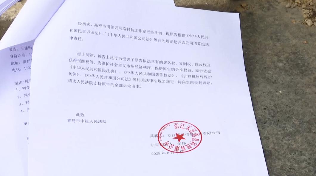 收到起诉信息后,王先生认真看了对方发过来的材料,才发现是自己2022年7月份在淘宝平台花了49块钱购买的源码出了问题。王先生说,当时商家说是开源的可以正常使用。2025年8月19号,他收到了青岛中级法院的信息,说浙江禾匠信息科技有限公司要起诉他,这家公司王先生并不了解也不认识。